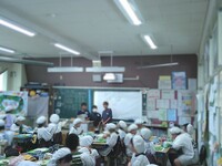 給食時間は、給食委員の児童が事前に作ったタイを紹介する資料をもとに、各クラスに発表にいきました。