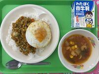 ガパオライスは、パプリカとピーマンのいろどりをきれいにのこしたまま、調理員さんが仕上げてくれました。
