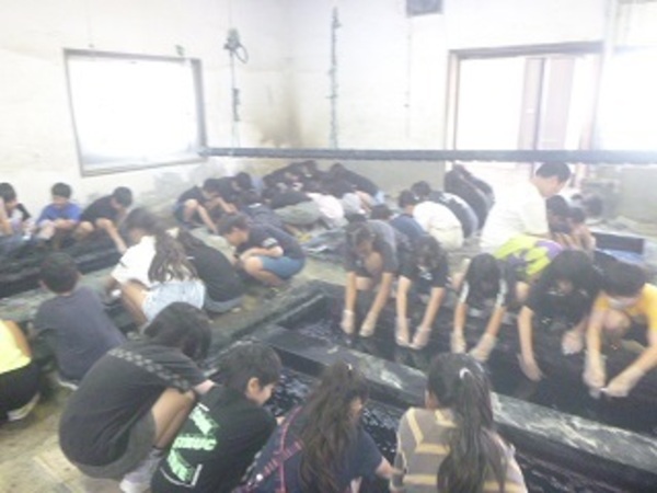 恵まれた晴天の中、羽生市の武州中島紺屋へ行きました。ここでは、藍染め体験で自分で輪ゴムでしばって、模様を想像しながらハンカチを染めました。それぞれ美しい模様に染まって、うれしい笑顔があふれました。昼食後、自動車工場見学(SUBARU・太田市)です。展示を見たり、VRゴーグルで工場見学をしたり、実際に工場内を見学したりしました。工場内はとても広く、大きな自動車の部品や車体が流れ作業で組み立てられていくところを見ました。VRゴーグルでは人が入ることができない作業場所などに入っていくような映像を見ることができ、思わずびっくりしたり、歓声をあげたりし、気持ちを揺り動かされ、思い出に残る学習になりました。