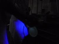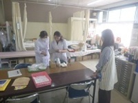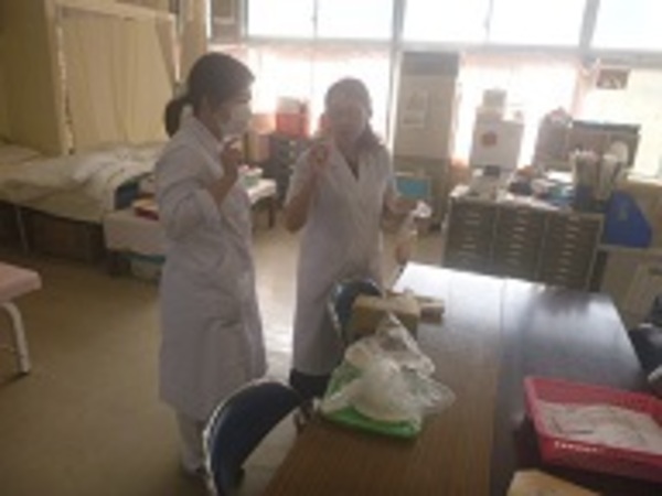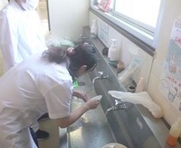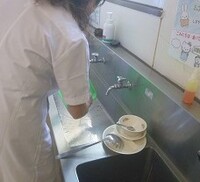 今日は学校薬剤師さんが来校し、養護教諭や栄養教諭と検査をしたり話し合ったりしました。学校薬剤師さんは教室の明るさや空気の質、水道水の点検など、子どもたちが安心して学校生活をおくることができるように検査をしています。今日は給食の食器が適切に洗浄されているかの点検を行っていました。食器類に検査のための液体をかけたり、暗いところで特別な光を当てて適切に洗浄されていることを確認していました。