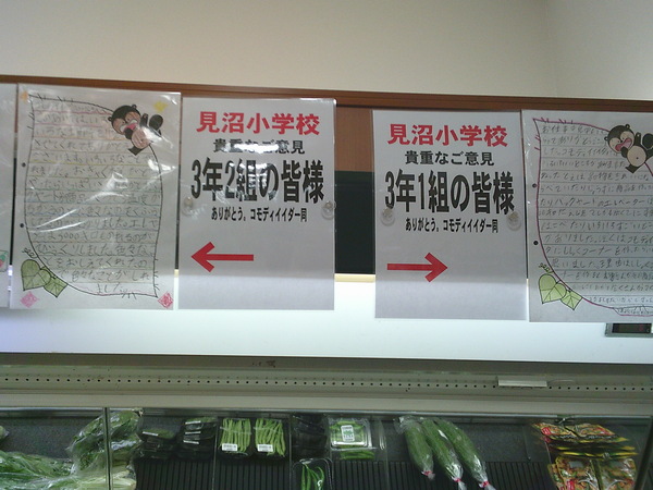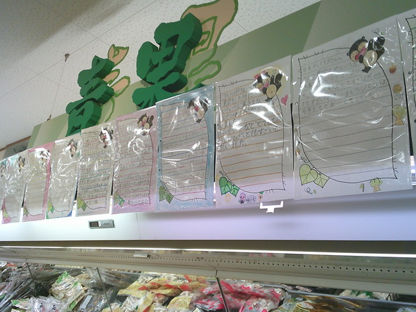 見学の後、子どもたちは感謝の気持ちを込めて、お礼のお手紙を書きました。そのお手紙を、なんとスーパーマーケットの店内にかざっていただいています!