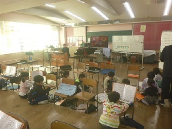 この音楽の授業では、曲想にふさわしい演奏をすることに興味をもち、音楽活動を楽しみながら、主体的・協働的に学習活動に取り組むことがめあての一つです。鍵盤ハーモニカの演奏をきき合ったり、木琴や鉄琴の練習を熱心に行ったりしていました。
