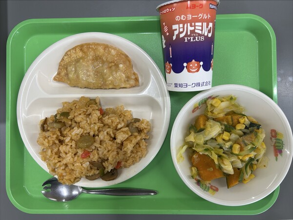 メニューは、メキシカンピラフ パリツォーネ かぼちゃのサラダでした。