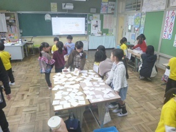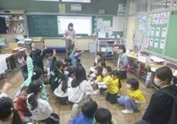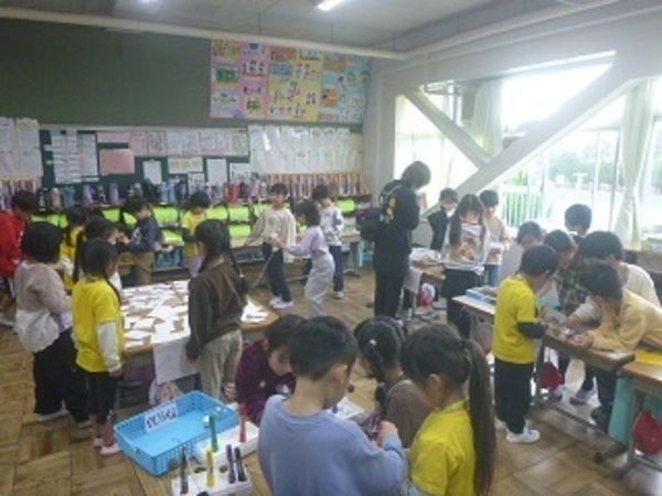 1年生活科で秋の自然と関わる活動を通して、遊びや遊びに使う物を工夫してつくります。つくったおもちゃで試し遊びを繰り返して、自分のおもちゃを改良し、遊びに使うものを工夫してつくることの面白さを実感することがめあての一つです。今回はつくったおもちゃで来年度新1年生となる園児を17名招待し、一緒に遊ぶことを通して交流しました。