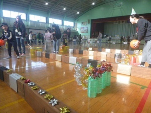 「メリークリスコア」では、キラキラのピンをボールを転がして倒します・・いくつたおれるかな