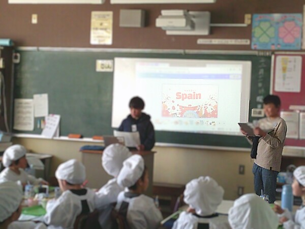 給食時間には、給食委員会の児童が、委員会の際に作成した資料を担当クラスに発表しました。