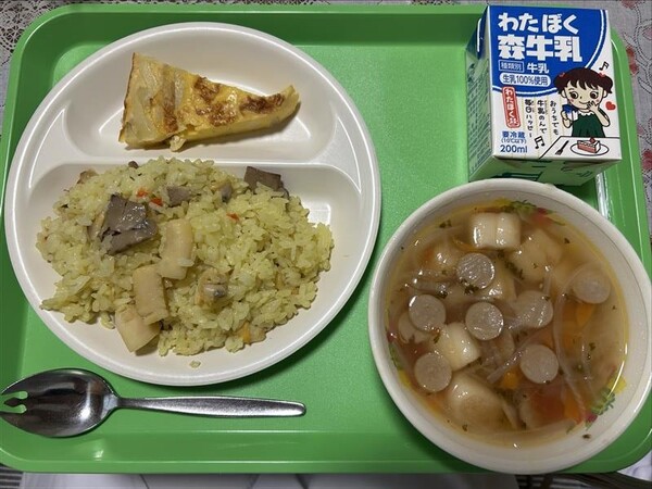 献立は、パエリア、トルティージャ、ソパ・デ・アホ、牛乳でした。