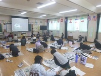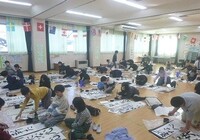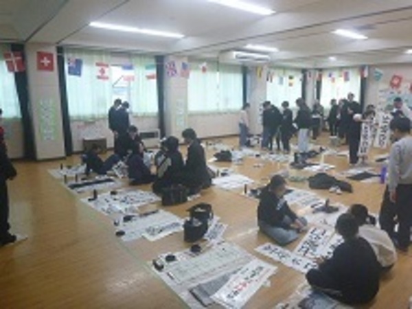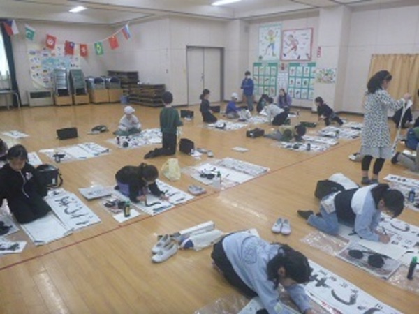 本校でも書き初めの学習が始まっています。大きな紙に気持ちを込めて書くのは緊張します。適度な緊張感を学習意欲につなげて、広い多目的室で熱心に学習していました。