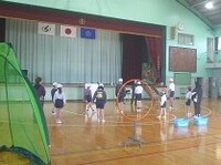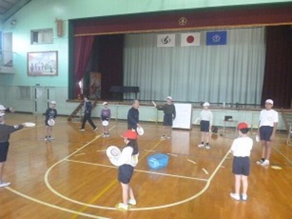 フライングディスク協会の方に来校いただき、5組児童がフライングディスクについて体を動かしながら学びました。上に投げて感触を確かめたり、真っ直ぐ投げるにはどうしたらよいか話を聞いたりしました。曲がる投げ方についても学びました。ゴールを狙って実際に投げて、楽しみました。遠くまで落ちずに飛んだり、ふわりと飛んだりする様子を見て、ボールと違う動きを実感しました。
