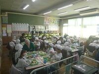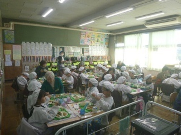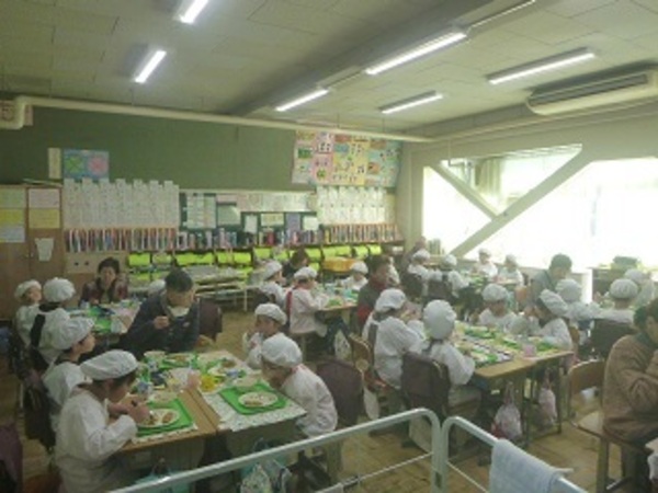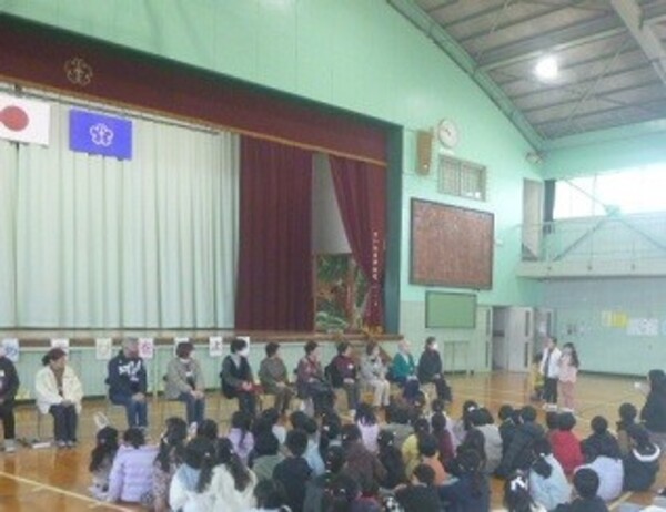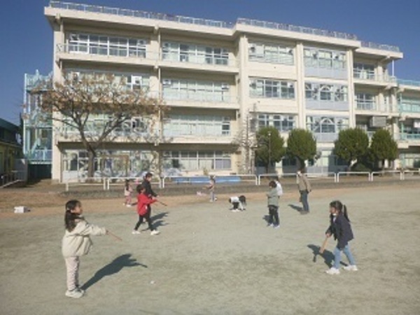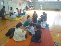 1年生の生活の学習で地域の方にゲストティーチャーとしてご来校いただき、昔から伝わる遊びを教わったり一緒に遊んだりして触れ合いました。暖かな日差しの中、校庭では羽根つき、体育館ではこま、けんだま、おはじき、お手玉、かるた、あやとりに分かれて遊びを通じて交流しました。給食交流会に参加していただいた方に、1年生児童が遊びのことや好きなことについて夢中になって話しかける様子が見られました。