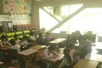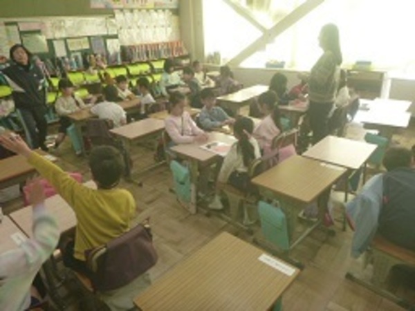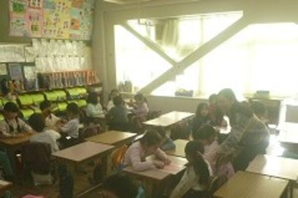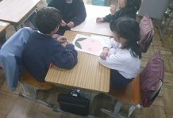 1年生がG・S(グローバル・スタディ)の学習で「ふくわらい」をしていました。担任とALT(外国語指導助手)の合図や話を聞きながらグループごとに行いました。ふくわらいを通して顔の部分の名称(nose,eyeなど)を英語で聞いたり、話したりしながら学習しました。友だちと関わりながら(コミュニケーションをとりながら)活動を行うことも大切にしたいことの一つです。