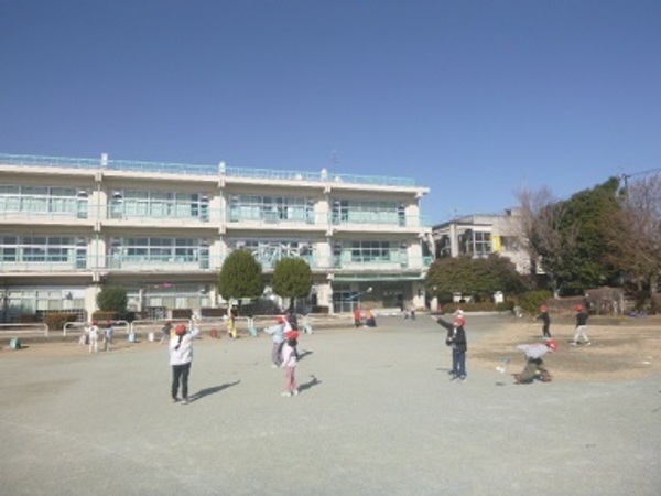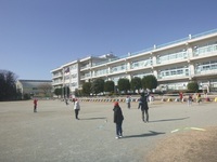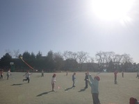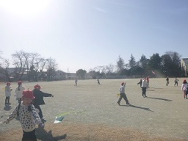 1年生がたこあげに夢中です。折り紙を使って作ったたこを持って走り回ります。勢いよく走り回ってたこを引っ張り、「くるくるしながら飛んでいる!」などの感激の声や、その場で糸を高く持って「風に乗っている!」と風をうまくとらえてたこをあげている子の歓声などが晴れ渡る校庭に響きました。