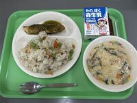 メニューは、えびピラフ 鮭のジェノベーゼソースがけ たまごとくきわかめのスープ 牛乳 ミルメークでした。