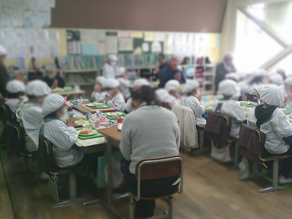 いつもお世話になっている地域の方々と一緒に2年生が給食の会食を行いました。