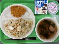 2月10日の給食は、開校記念日というおめで「タイ」日にちなみ、給食室でも愛媛県産の高級な鯛を使って「鯛めし」を作りました。