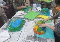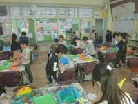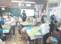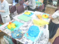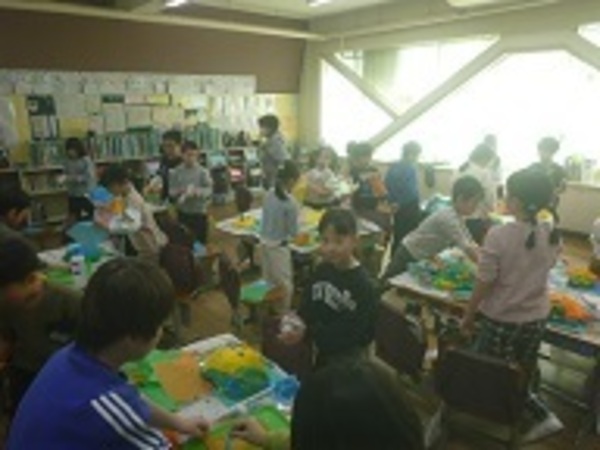 「かぶって へんしん」は、お花紙を重ねて貼り、張り子のお面をつくって遊ぶ2年生の図画工作の題材名です。水のりをたっぷりつけてぴちょぴちょしながら思い思いの色のお花紙を使って、帽子やお面を作りました。「○○に似せて作ったよ」「明るい色をたくさん使ったよ」「紙を30枚使った」など楽しそうに交流しながら取り組んでいました。