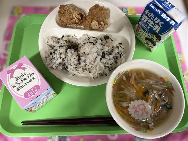 五穀わかめごはん、鶏肉のから揚げ、すまし汁、お祝いいちごロールケーキ、牛乳でした。