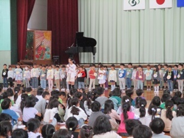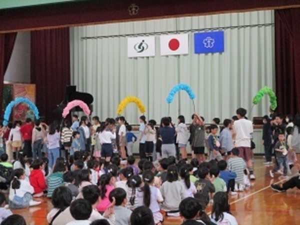 一年生はどきどきわくわく、上級生も「ようこそ」という気持ちで一年生を迎える会が行われました。一年生と六年生が手をつないで花のアーチをくぐって入場します。あたたかな拍手で迎えられました。にっこり、どきどき、うれしい気持ちがわいてきました。児童代表の歓迎の言葉を聞いて、上級生にダンス(だれにだって おたんじょう日)を見せてもらって、みんなであたたかな気持ちになりました。