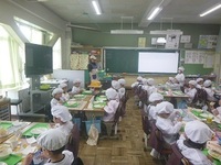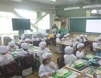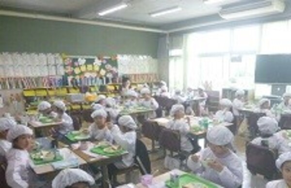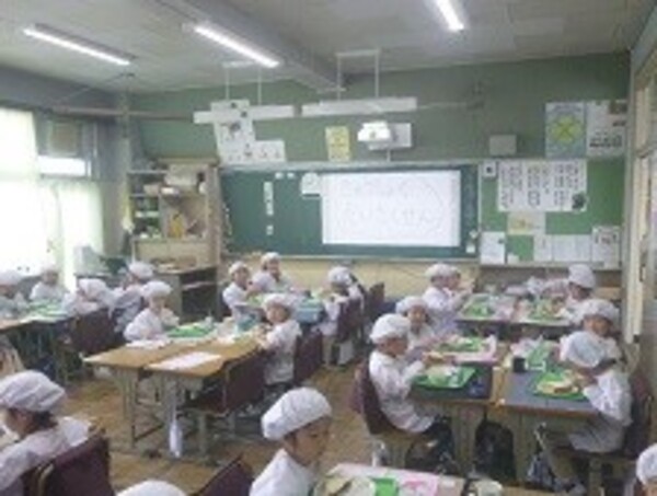 1年生の給食がはじまりました。着替えの練習をしてきた成果を出せたでしょうか。きれいな給食着に一生懸命着替えました。みんなで配膳、準備して、いよいよいただきます。献立は「いちごバターサンドイッチ」「春野菜のシチュー」などがあります。1年生が感想を言っていました。「パンがおいしかった!」「全部おいしかった!」にこにこ笑顔で楽しくお話ししながらおいしくいただきました。牛乳パックの片付け方は慣れないと難しいですが、頑張って取り組みました。